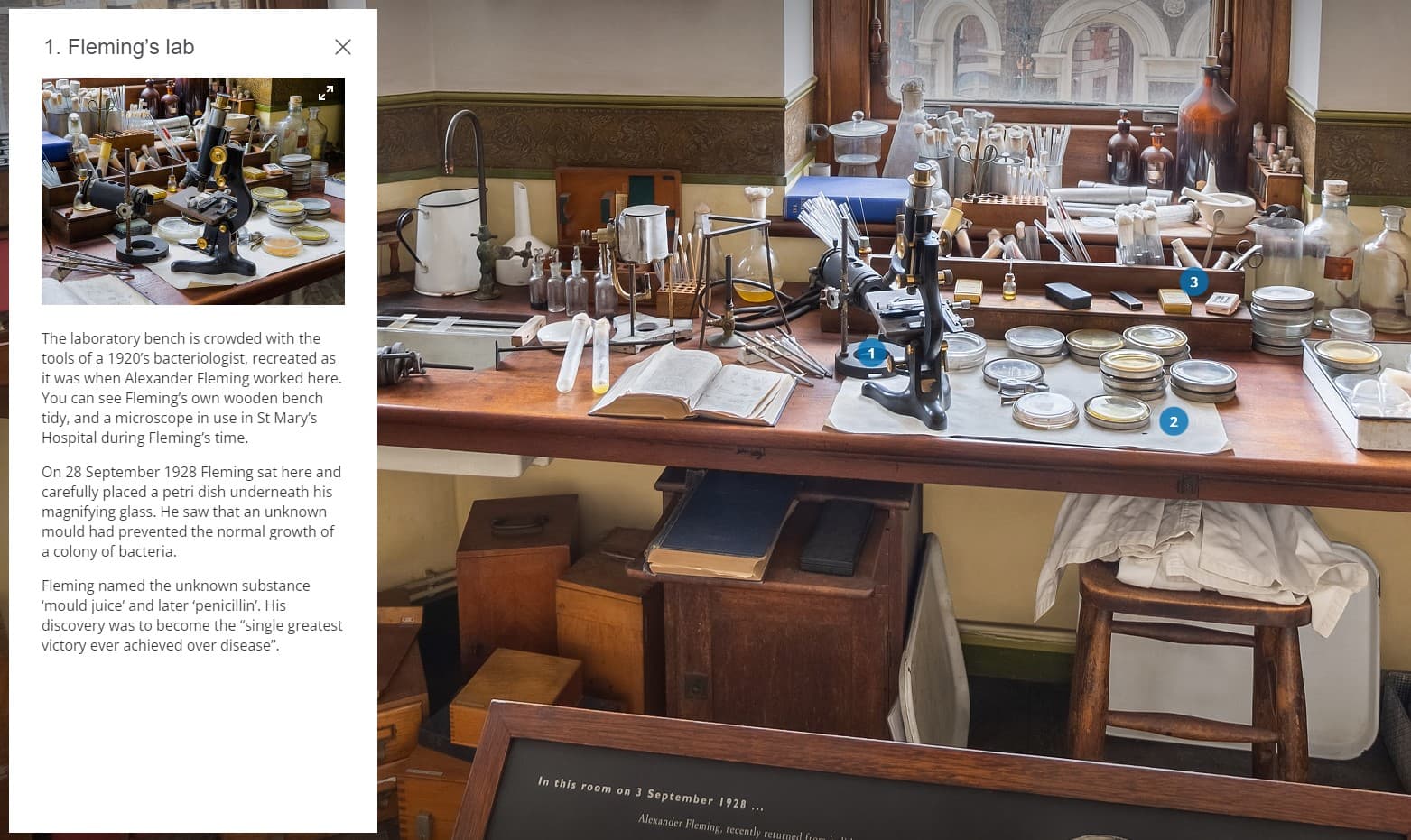 Having seen the virtual tour that ATS created for St James’s Piccadilly, the team at the Alexander Fleming Laboratory Museum were inspired to create a virtual experience for the office of Alexander Fleming, allowing online visitors to look around his desk, zoom in on particular items and discover more by clicking on particular items that had text associated with them.