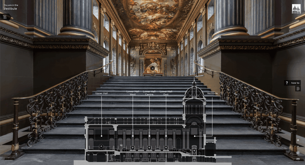 The 360° explorable virtual tour of the Painted Hall allows visitors to view the paintings in ultra-high resolution detail, either following a suggested tour route or through a self-led journey of the Hall revealing the symbolism that is featured in the painted scheme.