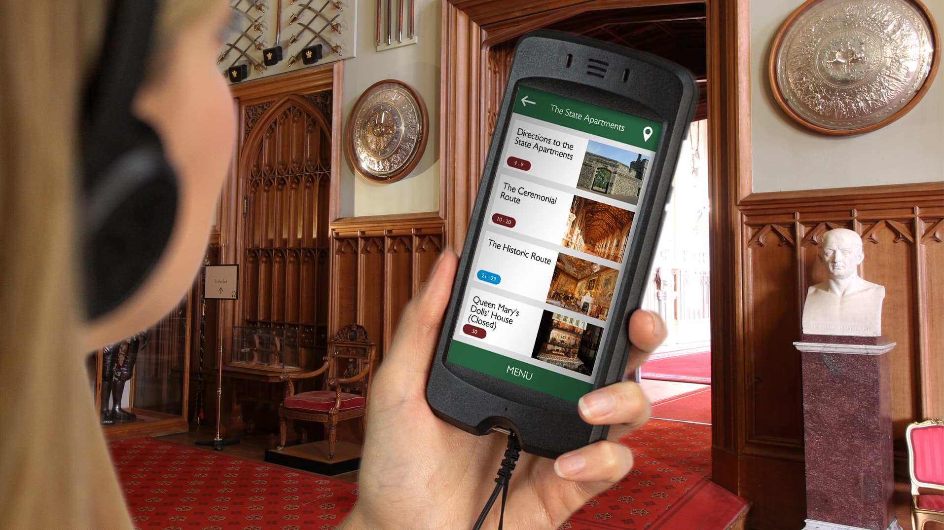 We were able to use our extensive experience of working at some of the busiest tourist attractions in the country to develop a wayfinding system for Windsor. Our bespoke interface allows visitors to choose the route they want to take and to explore topics and objects within it as well as to hear from experts who work in the castle. We also developed innovative ways of balancing the 1,000 year history of the castle with its contemporary use, including interviews with members of the Royal Family on what it’s like to live and work at Windsor.
